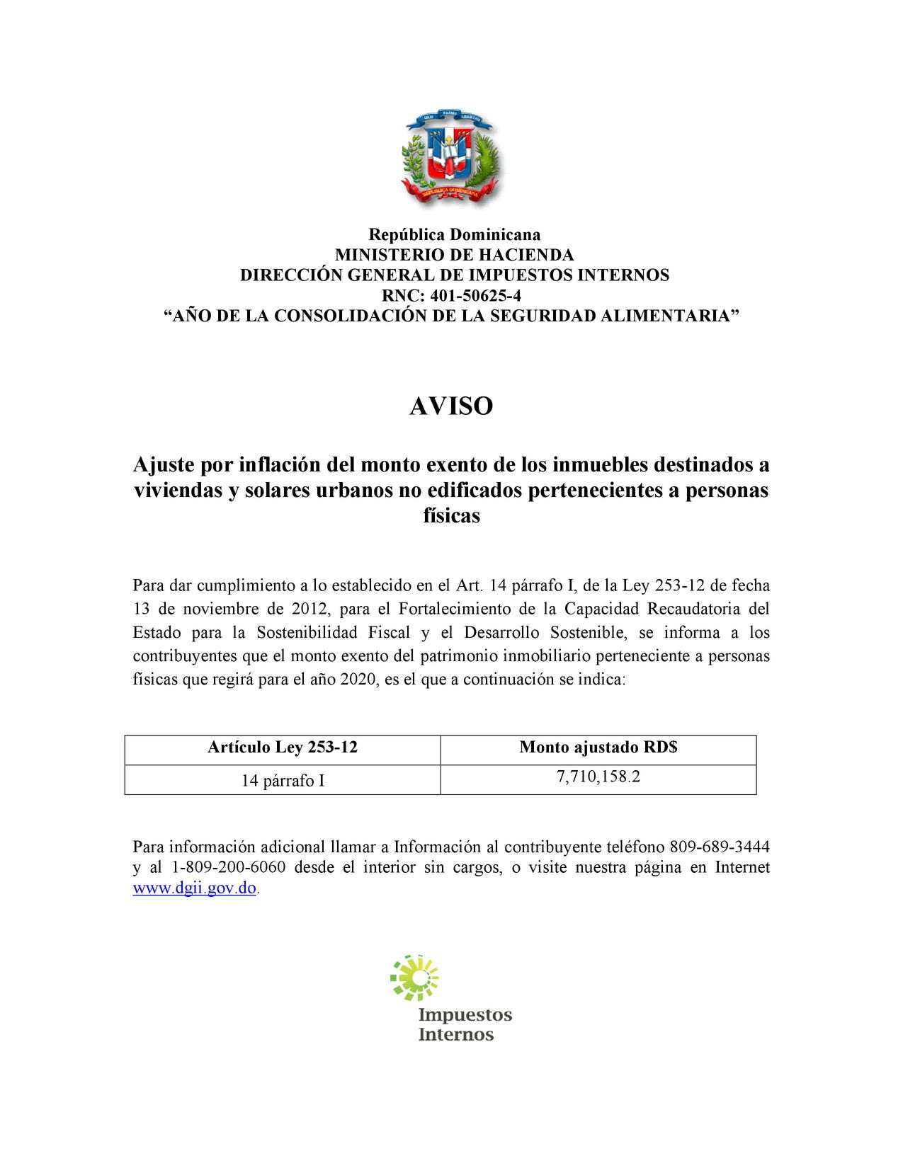 La Dirección General de Impuestos Internos (DGII) anunció el ajuste por inflación del monto que está exento del pago del Impuesto al Patrimonio Inmobiliario (IPI), de los inmuebles dedicados a viviendas y solares urbanos no edificados pertenecientes a personas físicas.
